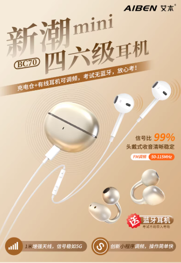 艾本深耕行业20多年,始终坚持以学生为本和技术革新的企业理念,领先于行业前沿。2025年革新推出的BC70新潮Mini四六级耳机,创新性实现“调频/蓝牙分离”功能——考试时可用有线耳机+充电仓进行调频,日常使用则化身高品质蓝牙耳机,这种“一机多用”的设计迅速成为大学生群体的新宠。